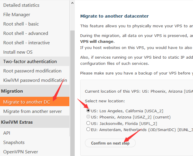 看到上图,当前我买的VPS是凤凰城数据中心的,我现在需要更换洛杉矶机房。所以,我在"US: Los Angeles, California [USCA_2]"选择,然后点击下面的COMFIRM ON NEXT STEP继续。