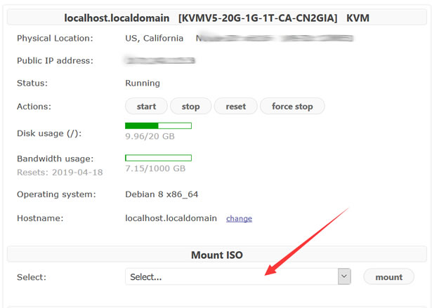 我们登录搬瓦工VPS主机《 搬瓦工VPS推荐方案》,这里建议我们使用1GB内存的配置,512MB内存估计嫌小的。我这里是用的洛杉矶CN2 GIA方案。看到上面面板中有Mount ISO,可以选择对应镜像。我用的是debian-live-8.11.0-amd64-gnome-desktop.iso。必须是要带desktop字符的。