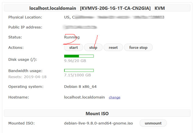 然后我们可以看到"ISO has been mounted.IMPORTANT: In order for changes to apply, VM must be completely stopped via Stop or Force Stop buttons on the main page of the KiwiVM control panel. Wait for VM to stop completely – make sure Status is Stopped. After VM stops completely, start it again."提示已经在挂载中。